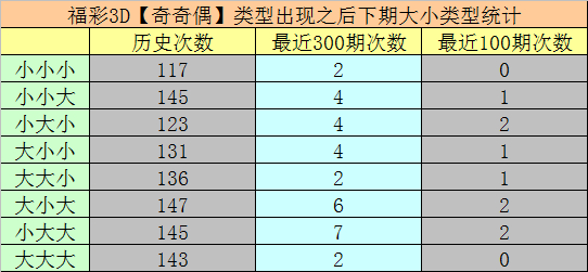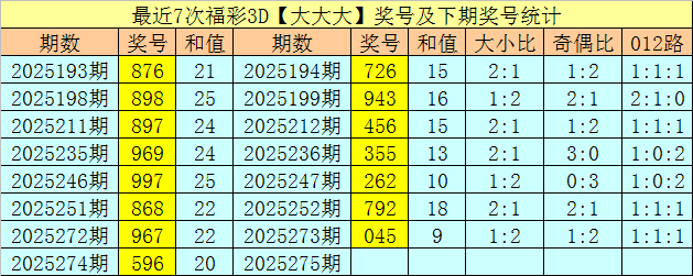 一、福彩3D上期奖号为596,大小类型开出:大大大,历史上该大小类型奖号共出现1088次,最近7次【大大大】奖号分别开出:876、898、897、969、997、868、967,其中组三号码出现4次,组六号码出现3次。